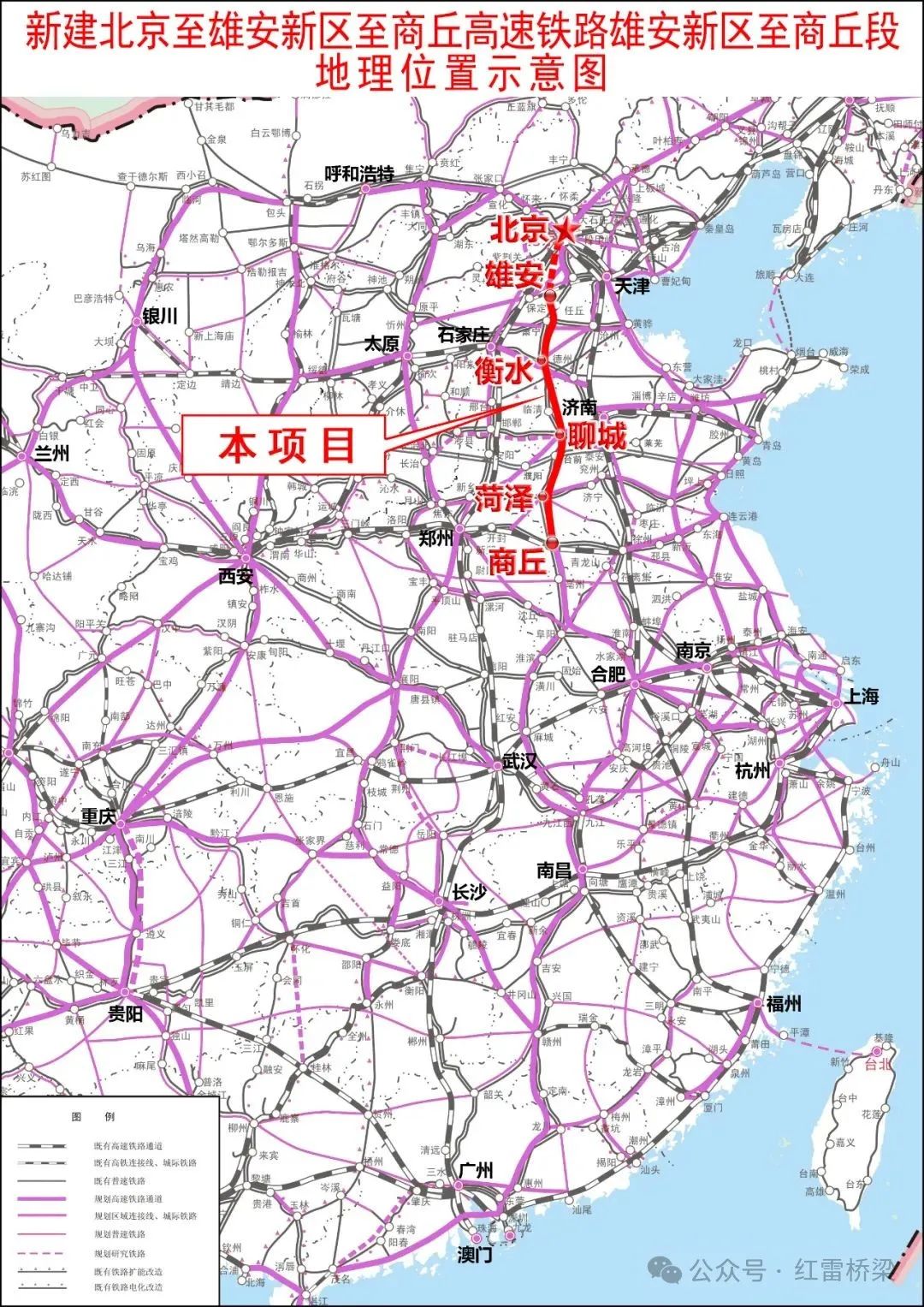 京雄商高速铁路,是一条连接北京市丰台区、河北省雄安新区与河南省商丘市的高速铁路,是“八纵八横”高速铁路主通道之一、“京港(台)通道”的重要组成部分。项目线路长度551.97公里,其中河北省境内257.82公里,山东省境内268.97公里,河南省境内25.18公里。全线正线桥梁521.47公里/16座,占线路长度94.47%。